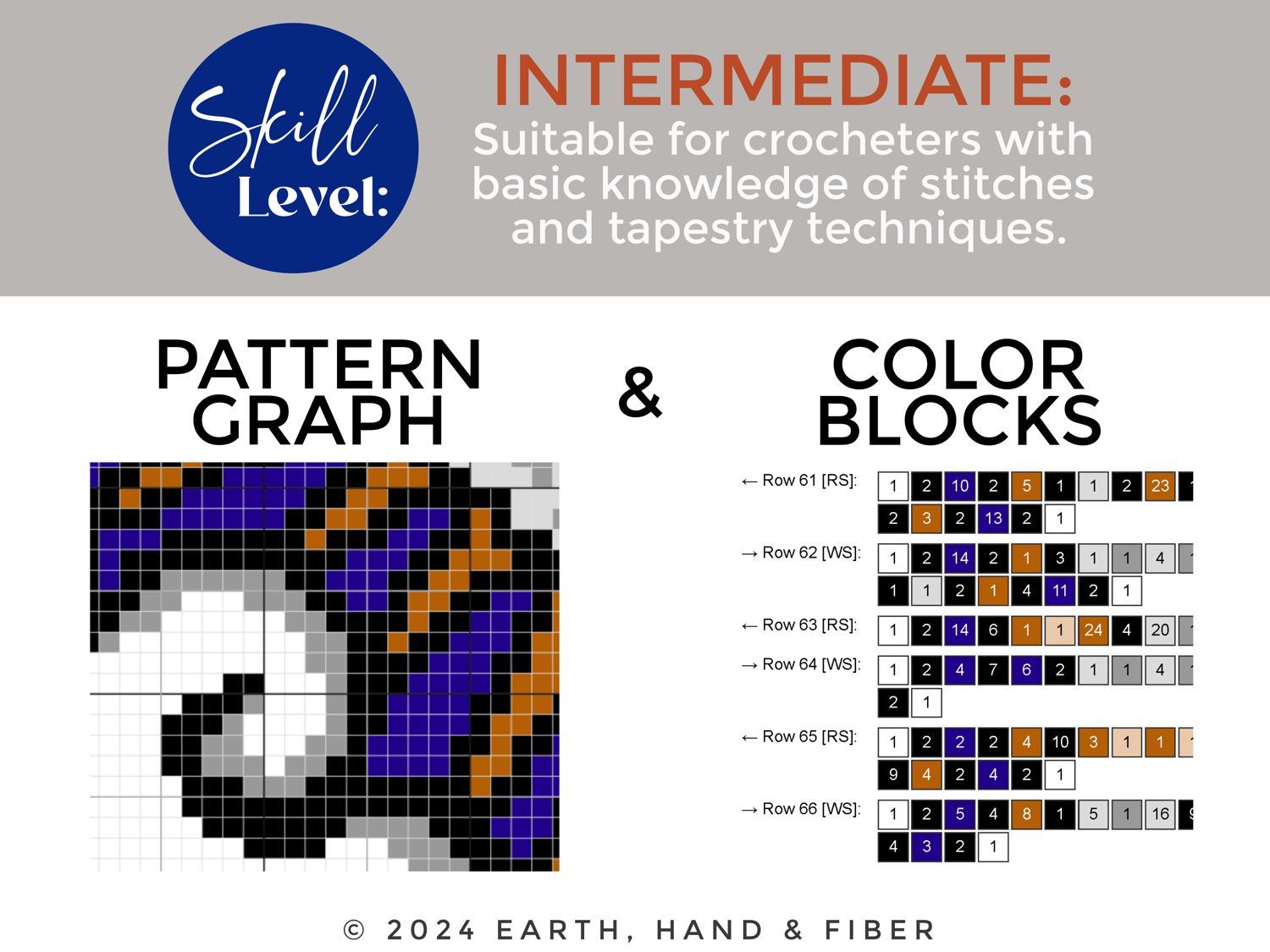 This pattern was designed for intermediate crochet artists with knowledge of tapestry crochet using multiple colors.