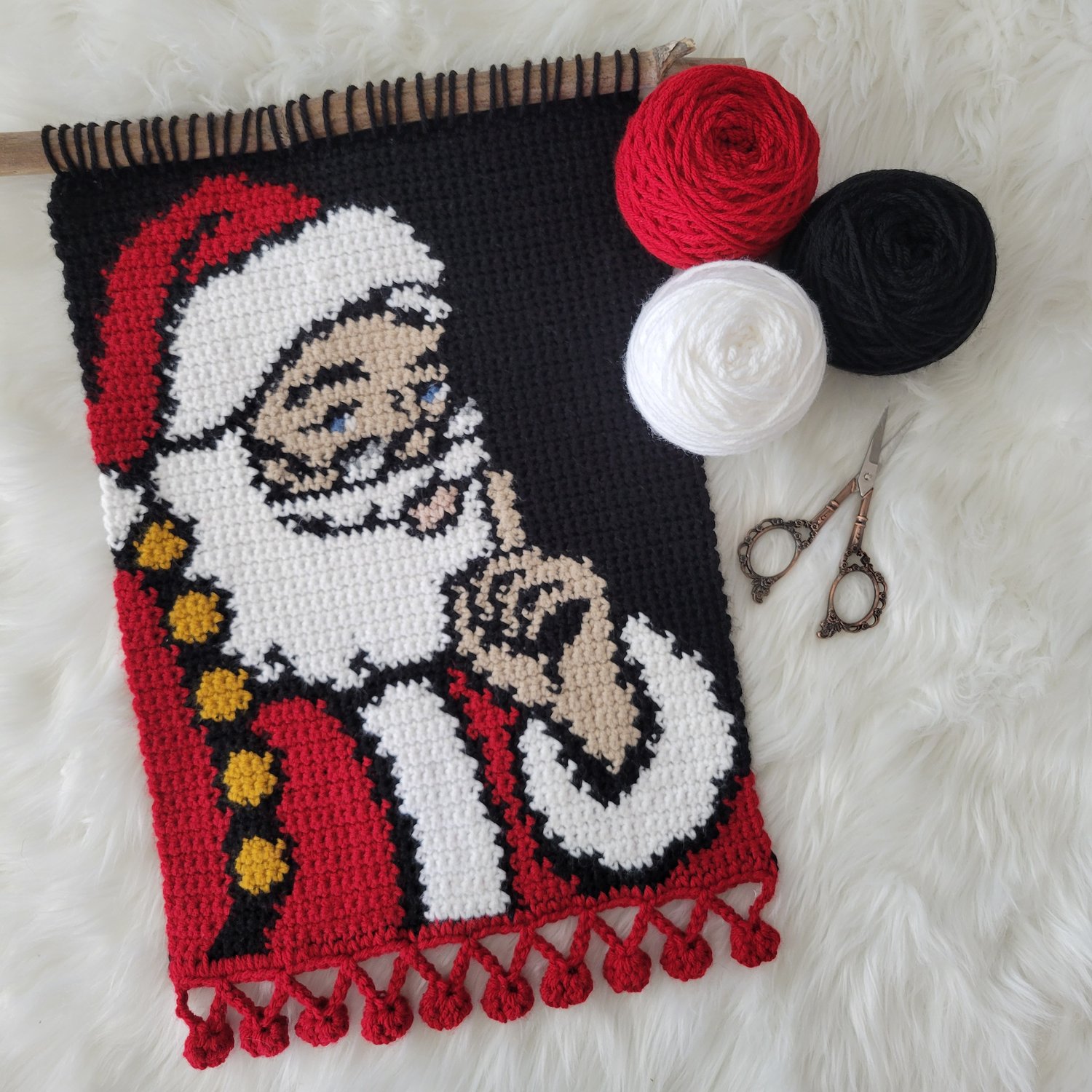 The Secret Santa Tapestry Crochet Pattern features a vintage-style Santa holding a finger to his lips in a classic shushing pose. Perfect for advanced beginners and great for wall hangings, gifts, or cozy seasonal displays!