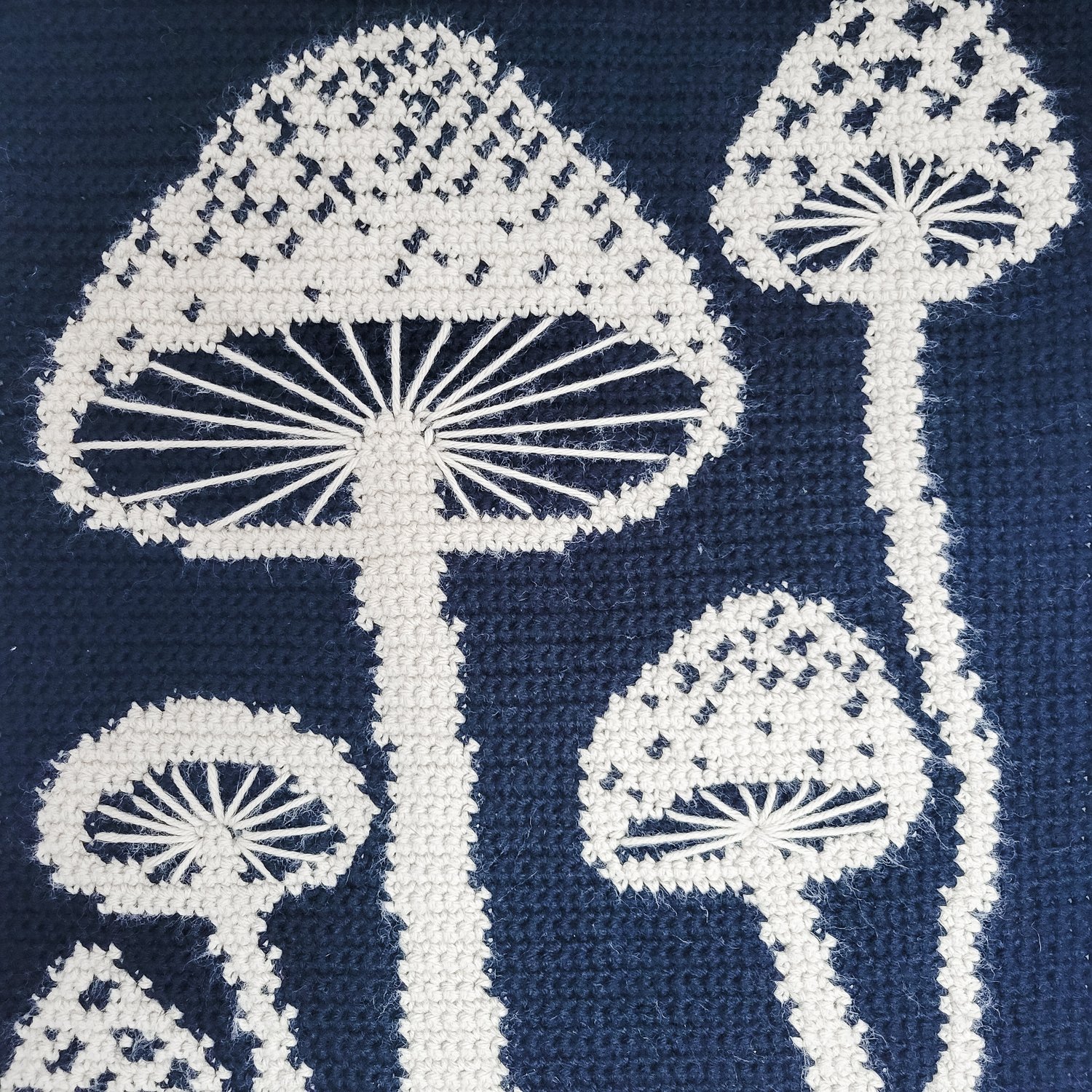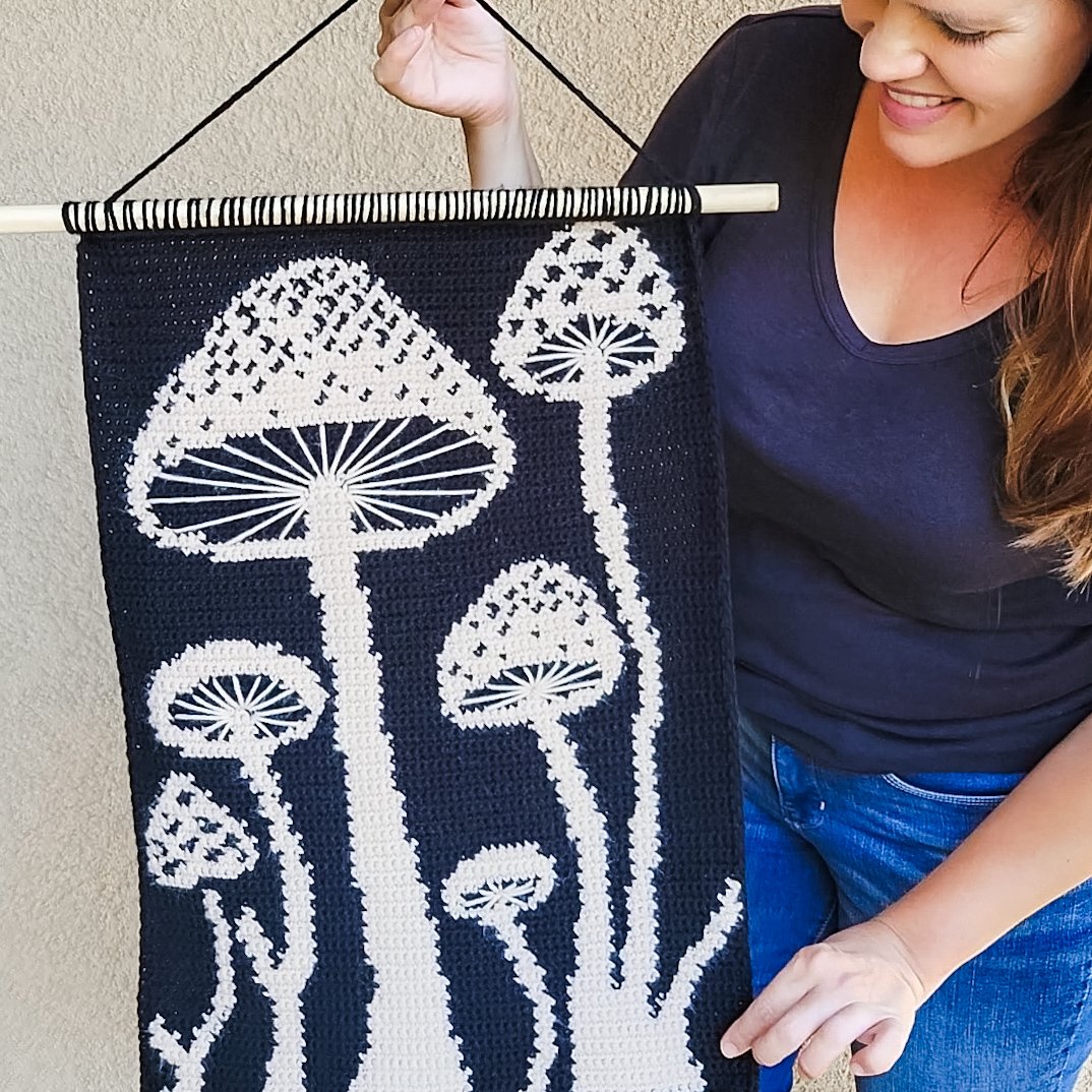 Create a whimsical mushroom forest tapestry that brings charm and warmth to any space. This two-color tapestry crochet design allows for easy customization, with optional embroidery to add intricate details and make each piece uniquely yours.