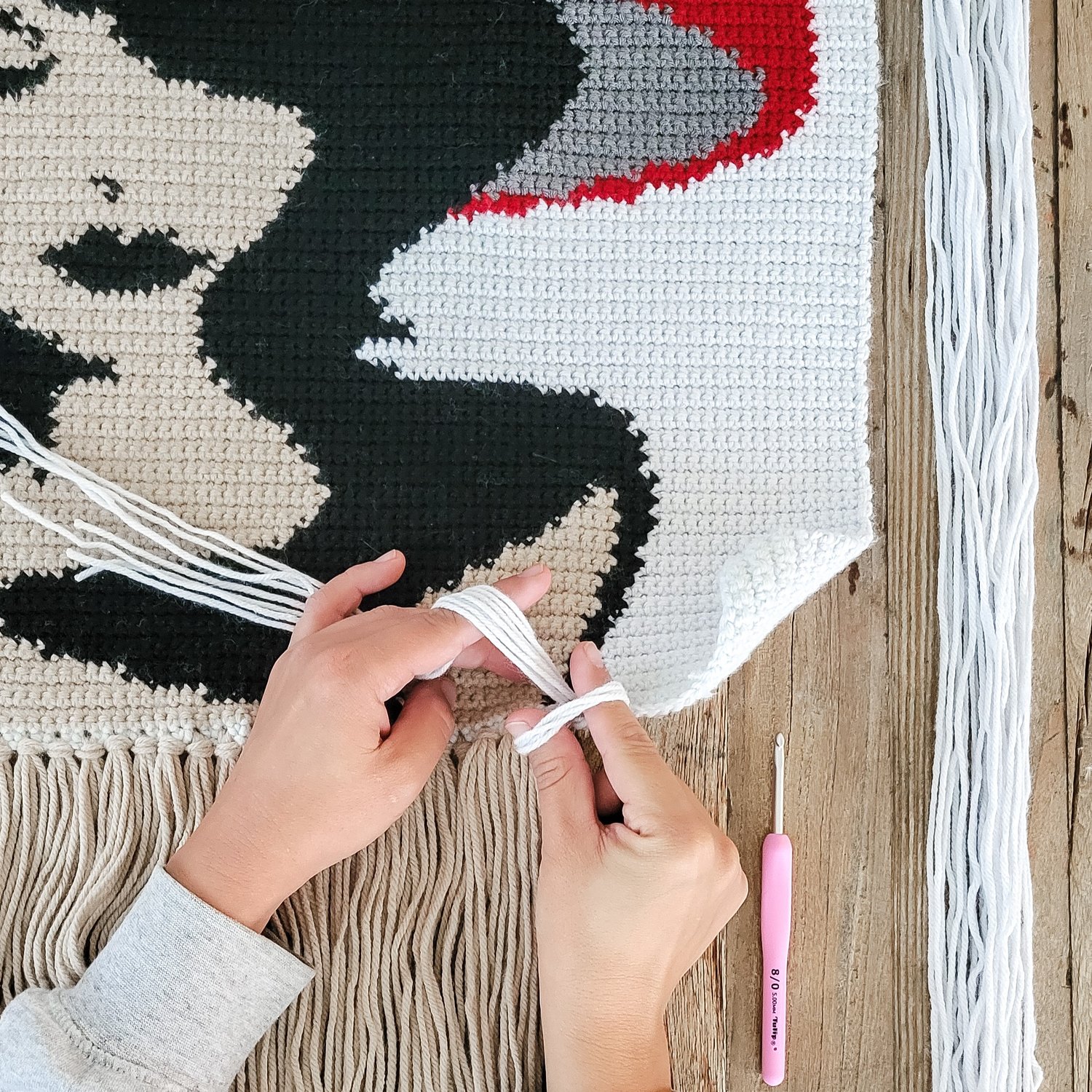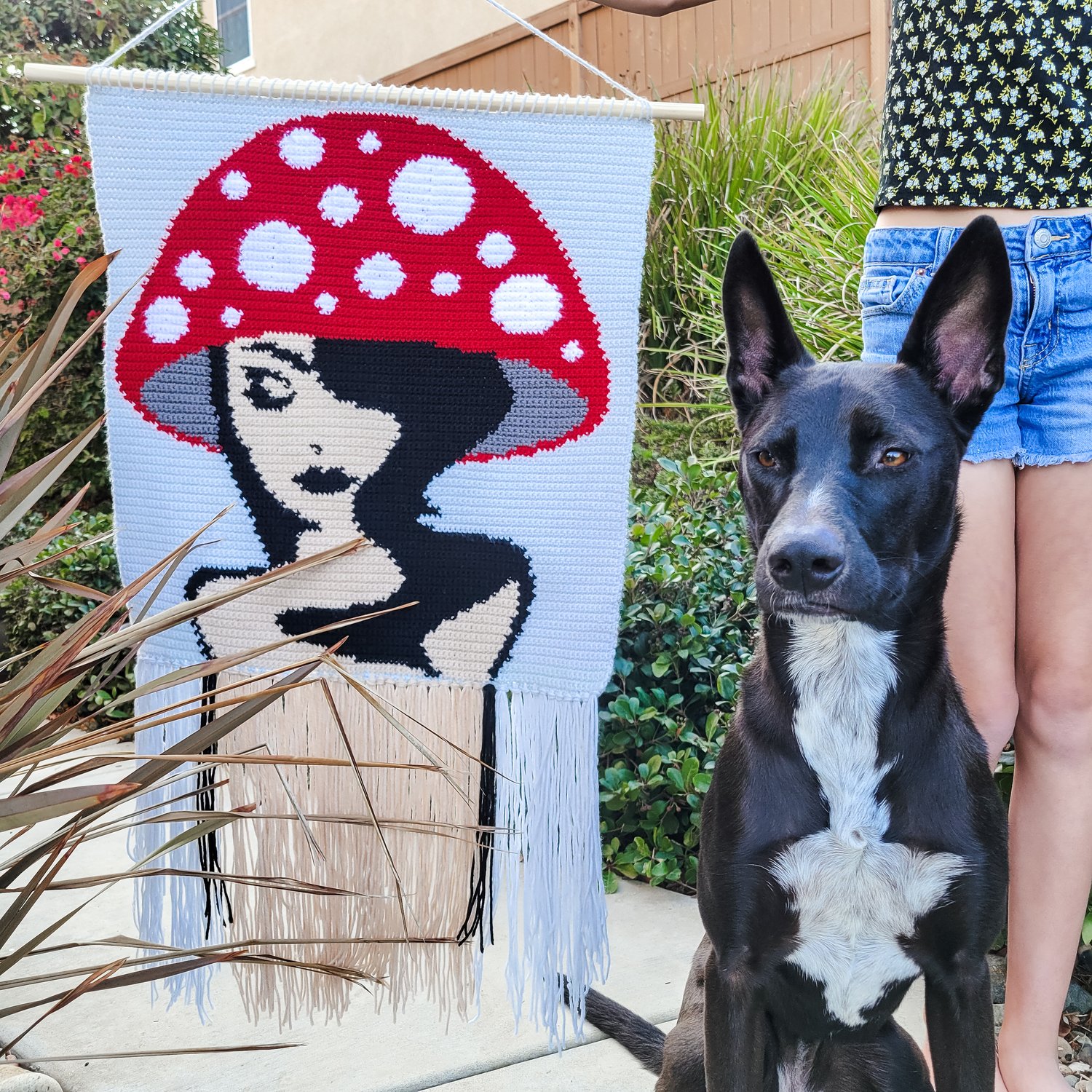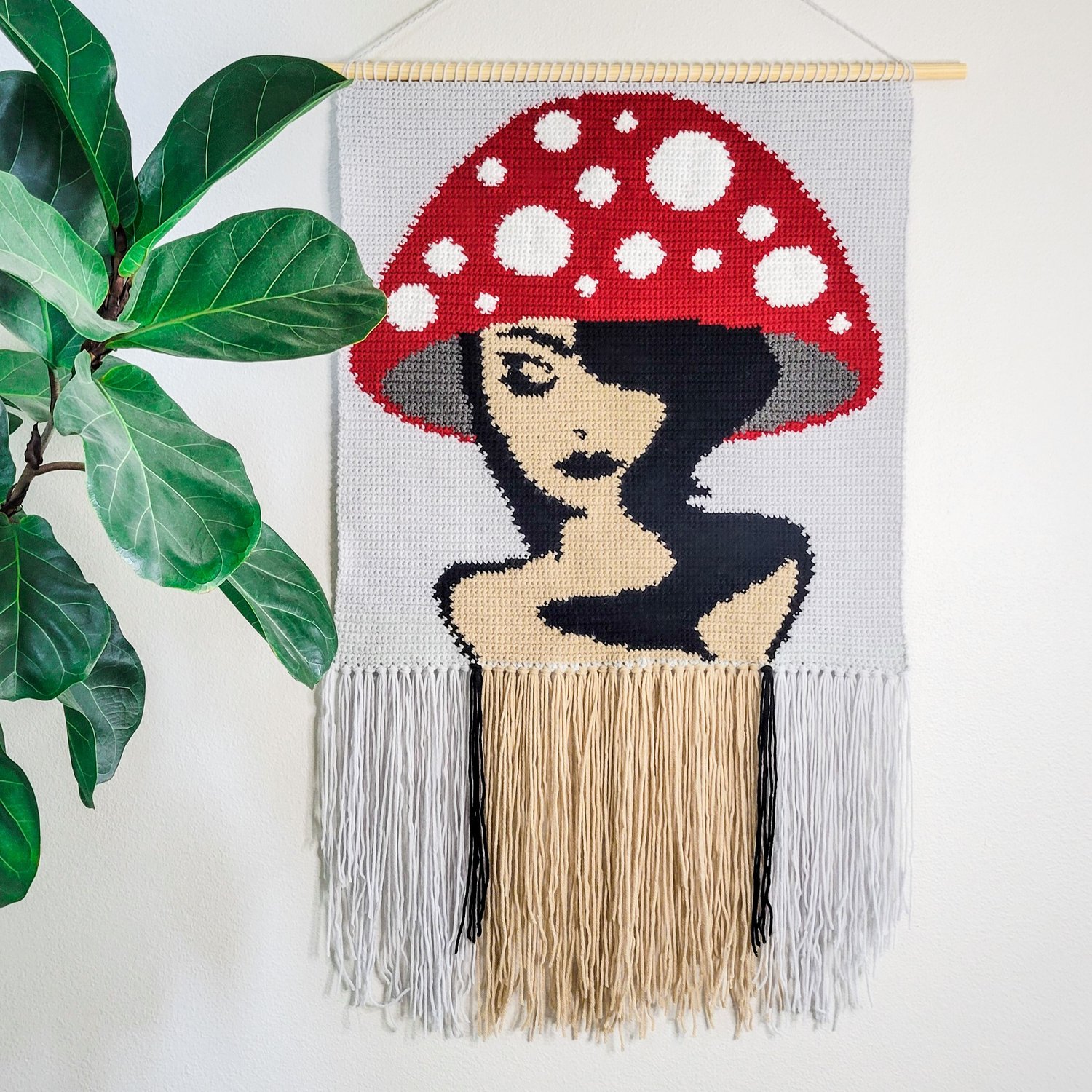 The Mushroom Goddess tapestry crochet pattern was designed to bring a sense of tranquility to your space. With her enchanting mushroom cap hat and soothing expression, the Mushroom Goddess embodies peace, nurturing energy and the enchanting beauty of the natural world.
