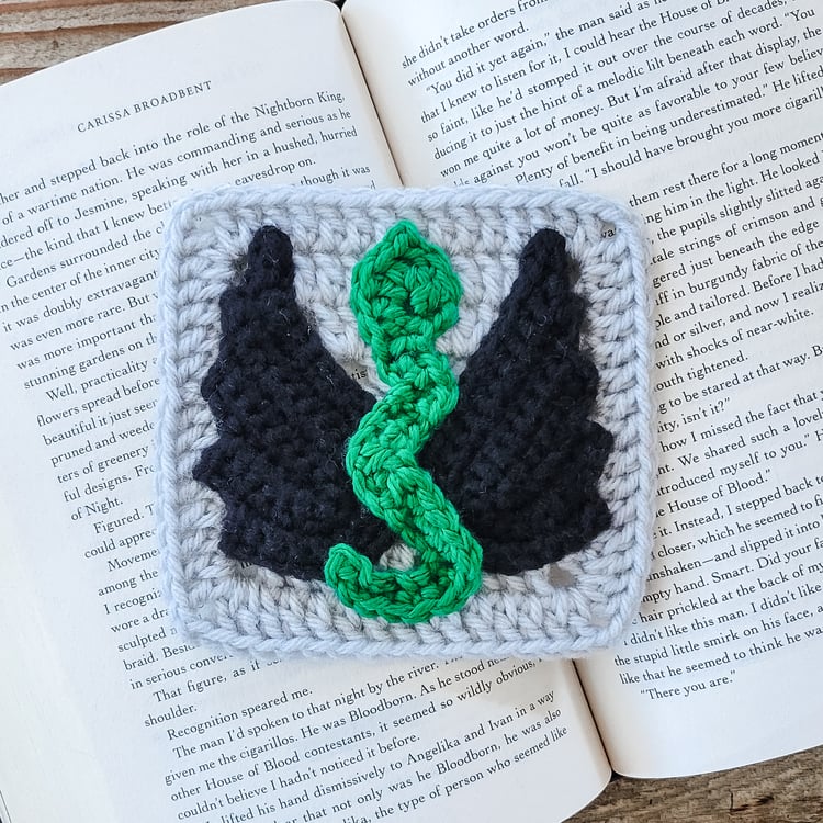 My first bookish granny square is inspired by The Serpent & the Wings of Night, featuring serpent and wing appliqués that capture the story’s dark, adventurous spirit.