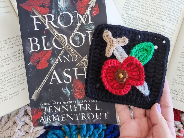 The From Blood and Ash granny square features a poppy flower and dagger, symbolizing Poppy’s courage and forbidden love in a world of strict rules and hidden truths.