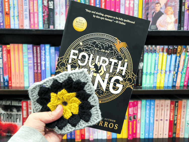 The Fourth Wing granny square features gold and black dragon scales representing Andarna and Tairn, capturing the strength, personality, and bond of these dragons within a delicate, petal-like granny square.