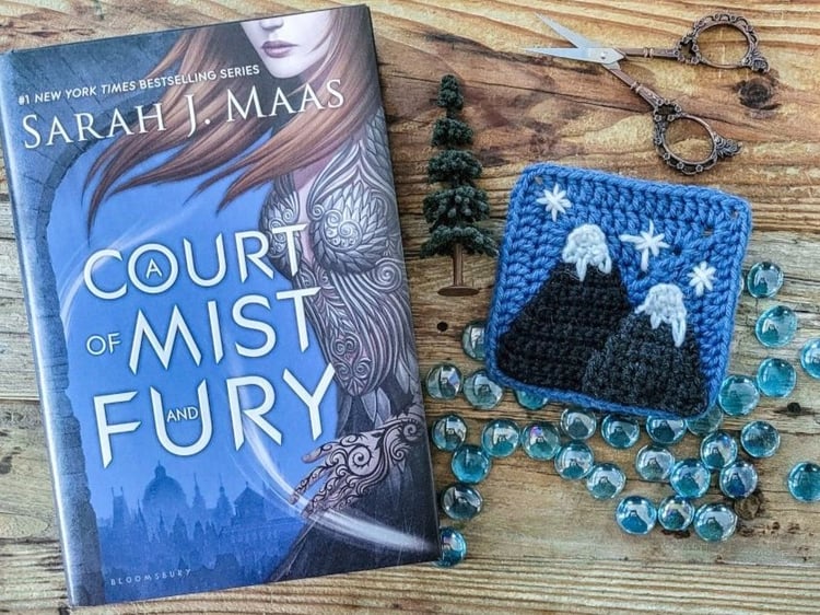 This granny square inspired by A Court of Mist & Fury features snow-kissed mountains and a starlit sky, capturing Feyre’s first awe-filled glimpse of Velaris and her journey of healing.